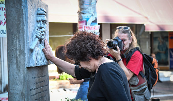 Με μάτια βουρκωμένα μέσα από τα γυαλιά της, η Μάγδα Φύσσα φίλησε το μνημείο που έχει στηθεί προς τιμήν του γιου της, άναψε ένα κερί και άφησε λίγα λουλούδια.