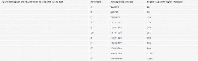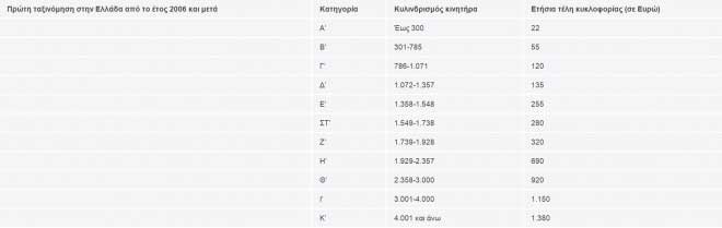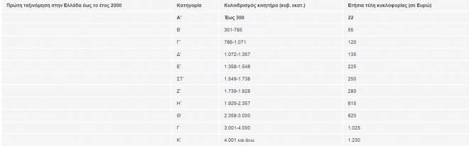 α) Επιβατικά αυτοκίνητα που έχουν ταξινομηθεί για πρώτη φορά στην Ελλάδα έως τις 31.10.2010 και δίκυκλες και τρίκυκλες μοτοσικλέτες ανεξαρτήτως της ημερομηνίας πρώτης ταξινόμησής τους στην Ελλάδα, με βάση τον κυλινδρισμό του κινητήρα αυτών, ως εξής: