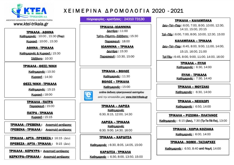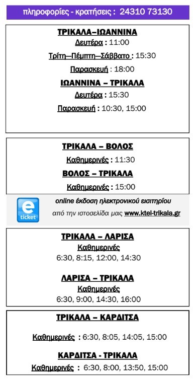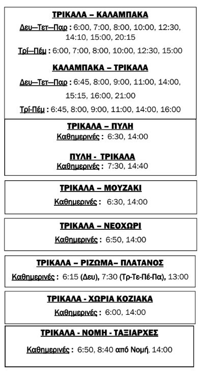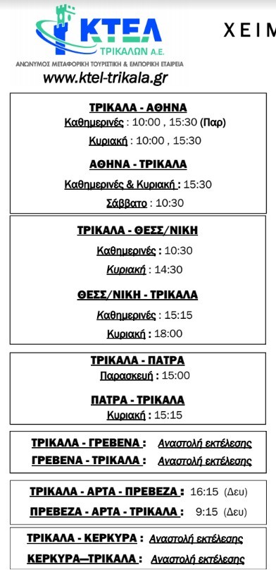 Το ΚΤΕΛ Τρικάλων ανακοίνωσε το νέο πρόγραμμα δρομολογίων το οποίο έχει ως εξής: