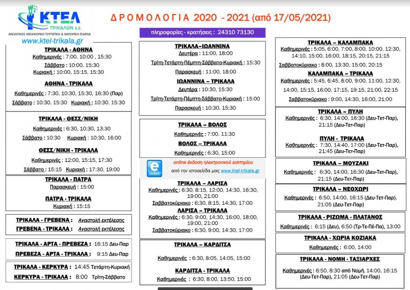 Το ΚΤΕΛ Τρικάλων ανακοίνωσε το νέο πρόγραμμα δρομολογίων το οποίο έχει ως εξής: