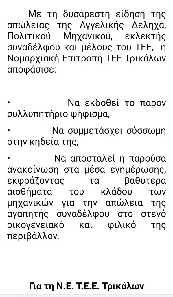 ΤΕΕ Τρικάλων : Έφυγε η συνάδελφος Αγγελική Δεληχα