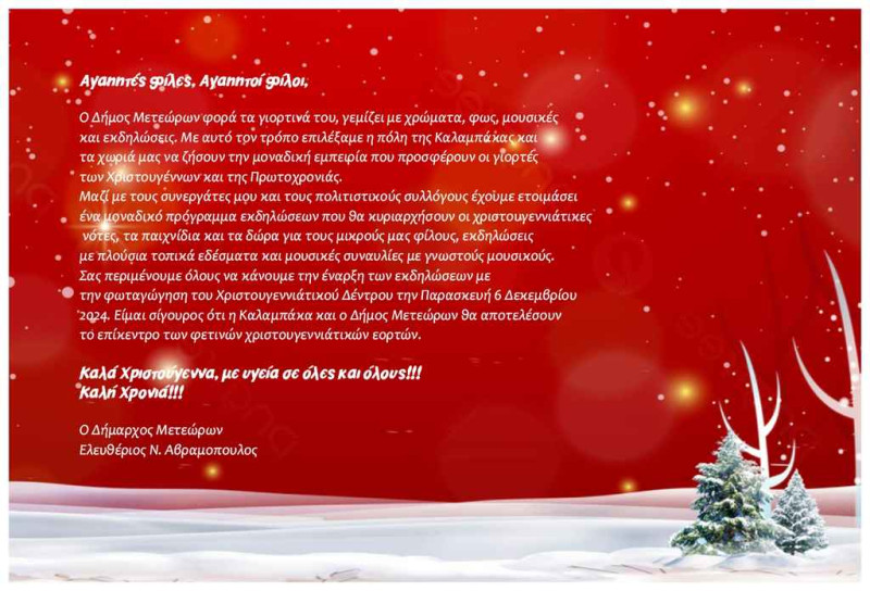 «Φέτος η Καλαμπάκα είναι πιο στολισμένη από ποτέ και συνοδεύετε από το μεγαλύτερο πρόγραμμα εκδηλώσεων που έχει γίνει ποτέ στο Δήμο μας. Αυτό το πετύχαμε μέσα από τη συνεργασία και το σωστό προγραμματισμό. Φοράμε τα γιορτινά μας, γεμίζουμε με χρώματα, φως και μουσικές την πόλη μας και τα χωριά μας και σας περιμένουμε να ζήσετε την μοναδική εμπειρία των Χριστουγέννων και της Πρωτοχρονιάς που προσφέρει η περιοχή μας. Καλά Χριστούγεννα με υγεία σε όλες και σε όλους. Καλή Χρονιά!!» δήλωσε ο Δήμαρχος Μετεώρων Λευτέρης Αβραμόπουλος.