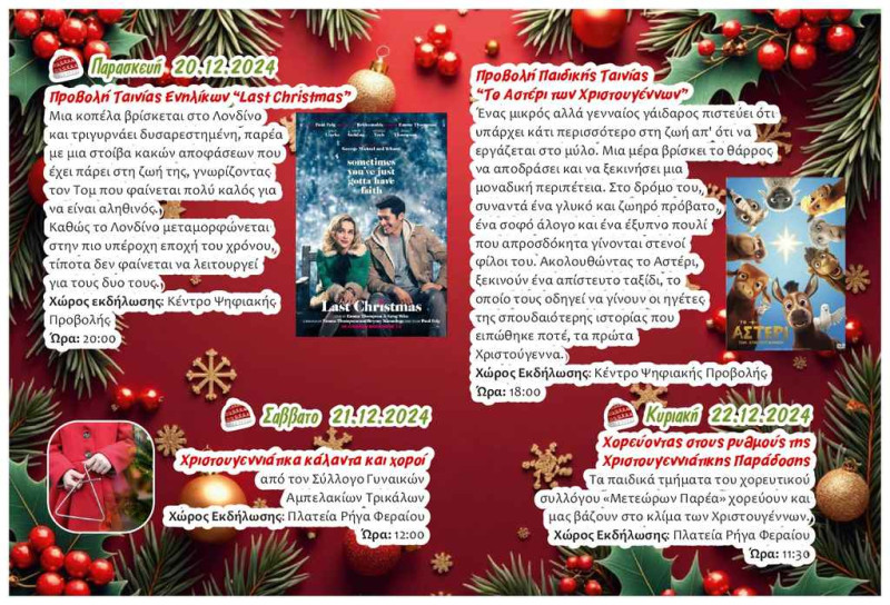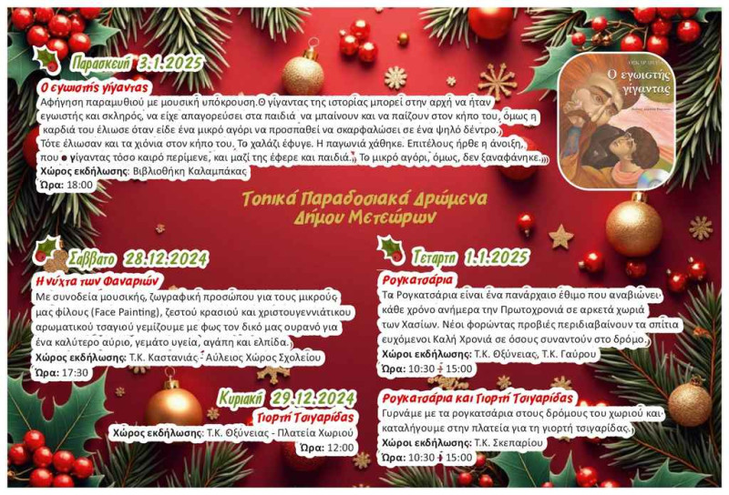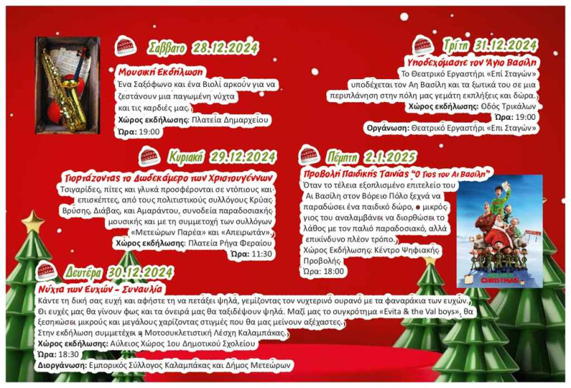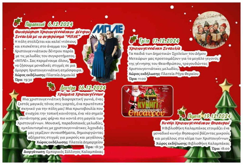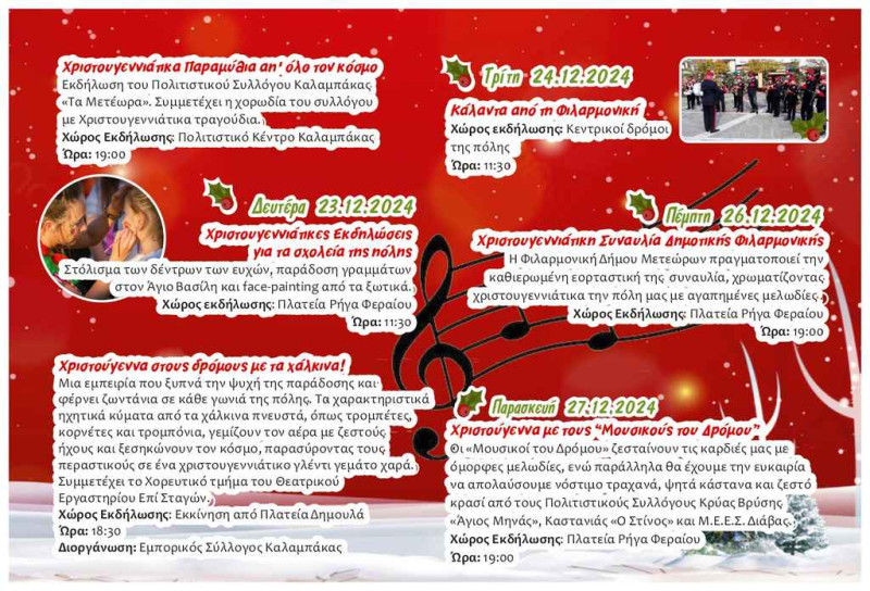 Παράλληλα η Δημοτική Αρχή φρόντισε να δημιουργήσει ένα πλούσιο πρόγραμμα εκδηλώσεων για μικρούς και μεγάλους που περιλαμβάνει παιχνίδια και ευχάριστές εκπλήξεις για παιδιά, δραστηριότητες και μουσικές συναυλίες για όλη την οικογένεια καθώς και εορτασμούς με τη συνοδεία τοπικών εθεσμάτων στο κέντρο της Καλαμπάκας. Την επίσημη έναρξη των εορταστικών εκδηλώσεων του Δήμου Μετεώρων θα σηματοδοτήσει η φωταγώγηση του κεντρικού χριστουγεννιάτικου δέντρου την Παρασκευή 6 Δεκεμβρίου 2024, στις 19:30 το απόγευμα, στην πλατεία Δημουλά.